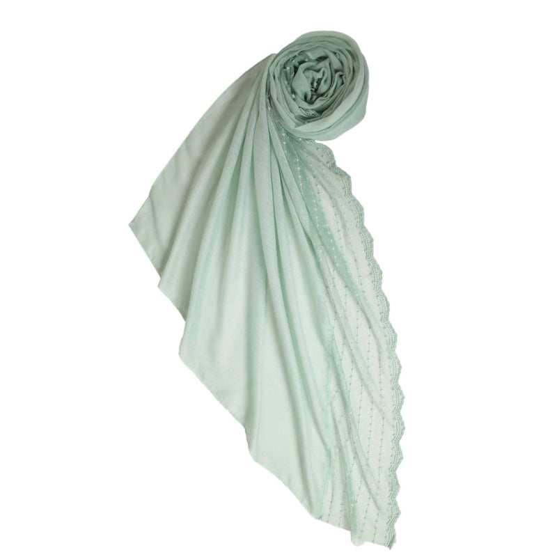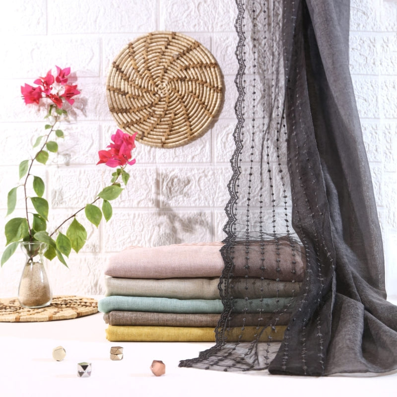Embrace the beauty of minimalism with this exquisite collection comprising soft and neutral tones. Each piece features a delicate lace border, adding depth and character. Material: Cotton Viscose Size: 35.5 x 78 inches Visibility: Slightly see-through Texture: Plain Ironing: Lightly required Note: