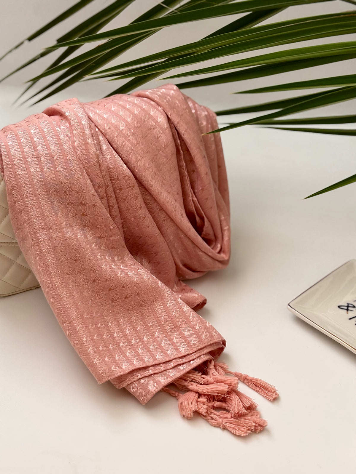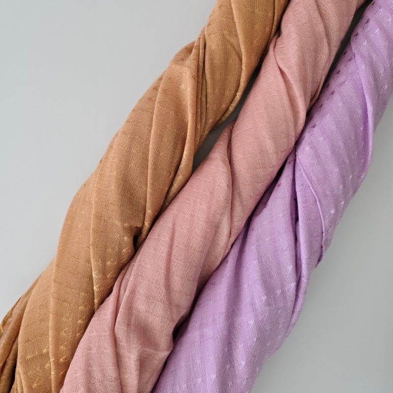 This beautiful scarf collection features a variety of rich and versatile shades, perfect for different occasions. The self print pattern on each scarf with subtle shimmering accents that catch light adds a refined detail, making them ideal for both everyday wear and formal settings.