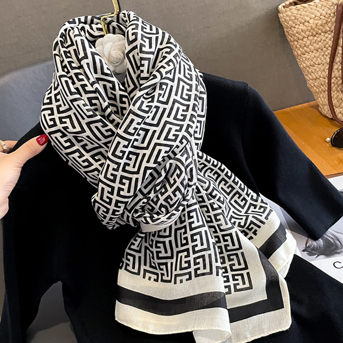 Discover the Graphite Collection — a trio of modern, statement scarves available in black, brown, and white. Each piece features a bold geometric pattern on soft, lightweight fabric, offering style that feels both contemporary and timeless. The black brings depth, the brown adds warmth, and the white offers a crisp, clean finish — a palette designed to suit every wardrobe mood.